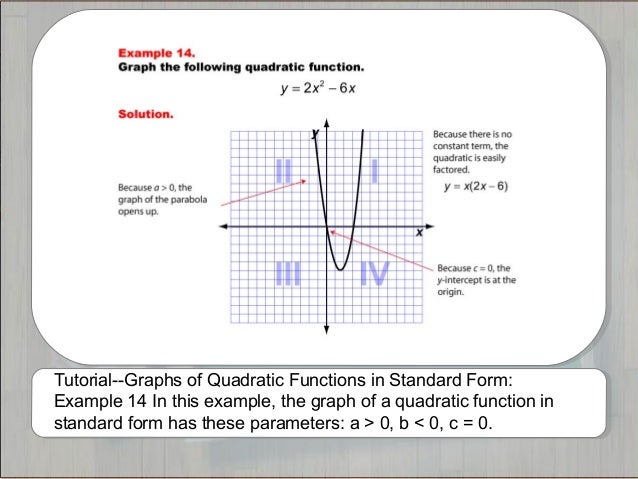 We know what we have to find, so let's find it. However, since quadratics graph as curvy lines (called parabolas. To draw the graph of a function in a cartesian coordinate system, we need two perpendicular lines xoy (where o is the point where x and y intersect) called coordinate axes and a unit of standard form: The graph of a quadratic function is a specific kind notice the correspondence between the coefficients of the standard form of the quadratic equation: This lesson provides helpful information on graphing quadratic functions in the context of quadratic functions and modeling to help students study for a college level quadratic functions can be graphed by transforming the parent function.